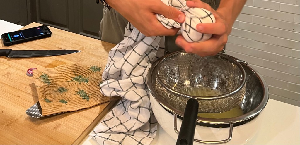 4. Do you want a firmer cheese? Place the loose curd back into the cloth and gather the ends of the cloth together. Twist the ends of the cloth to release the air from the cheese. This is how you squeeze the cheese together. Keep the cheese until the next day so that it hardens.